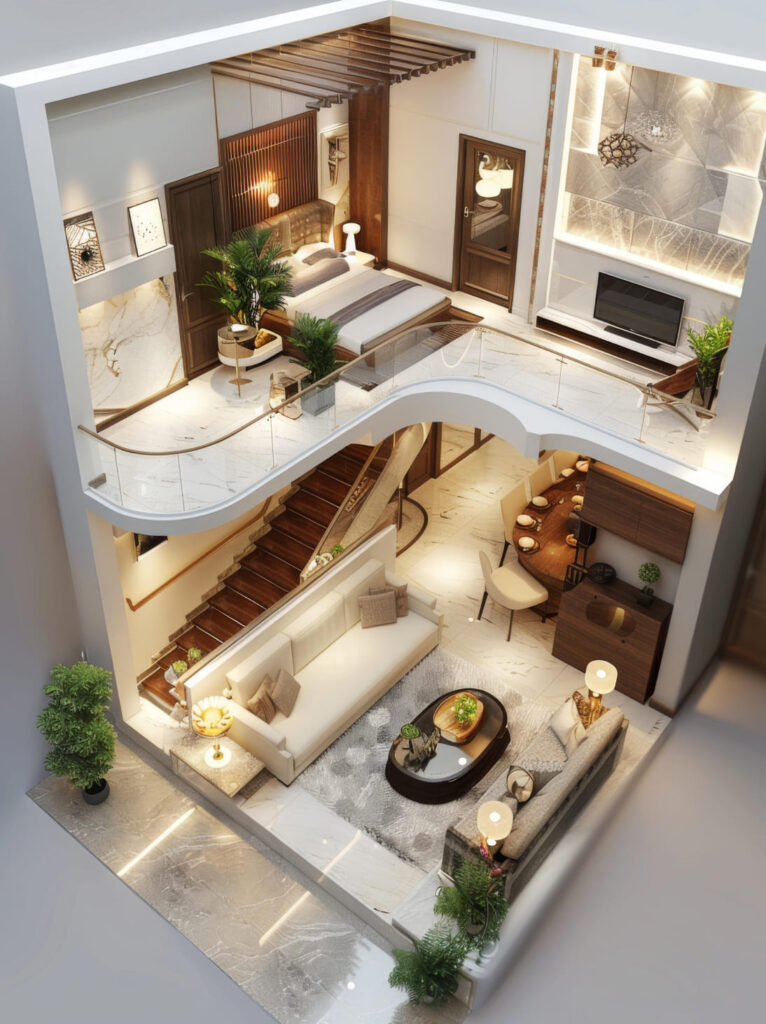 Architectural design within interiors ensures that spatial planning, structural elements, and built components work together harmoniously. It goes beyond surface finishes and furniture placement, addressing ceiling treatments, partition systems, built-in features, and structural enhancements.