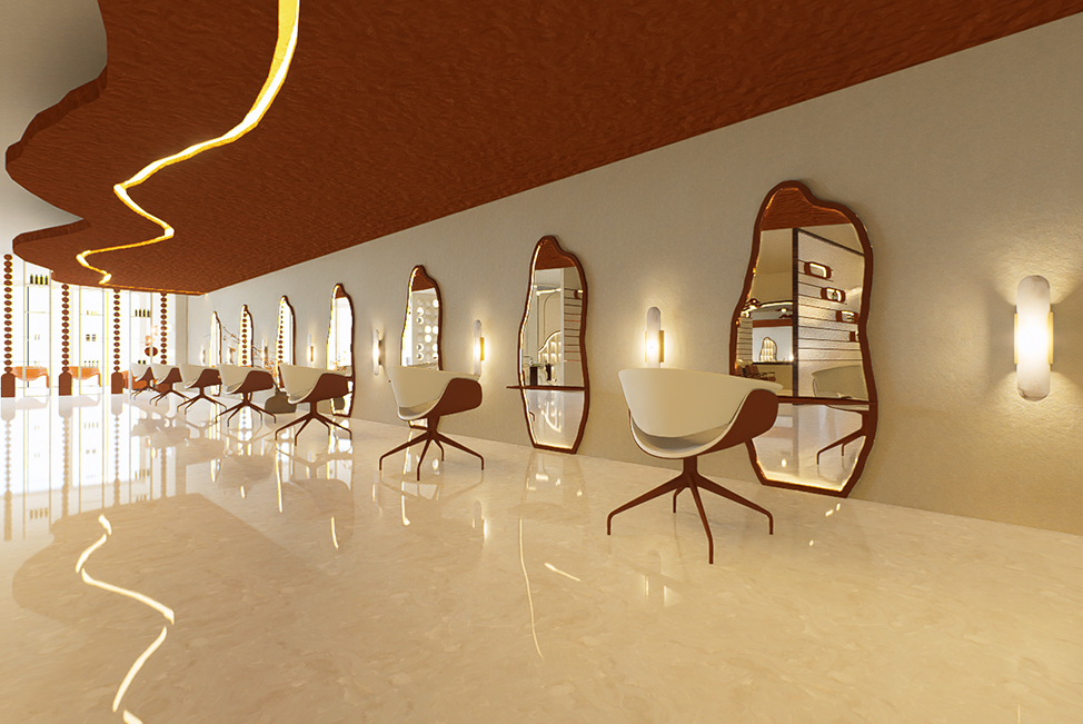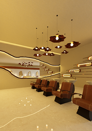 Layered warm lighting highlights textures, defines zones, and enhances the salon’s natural elegance.