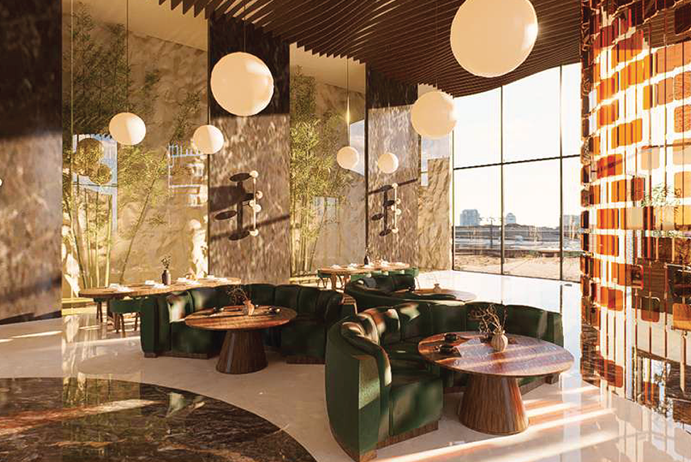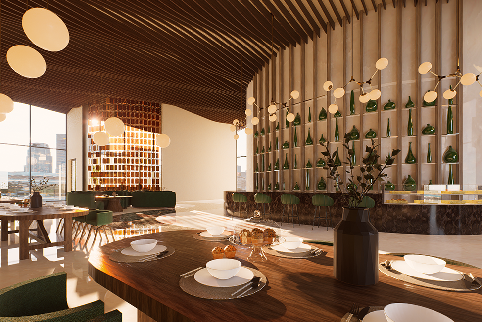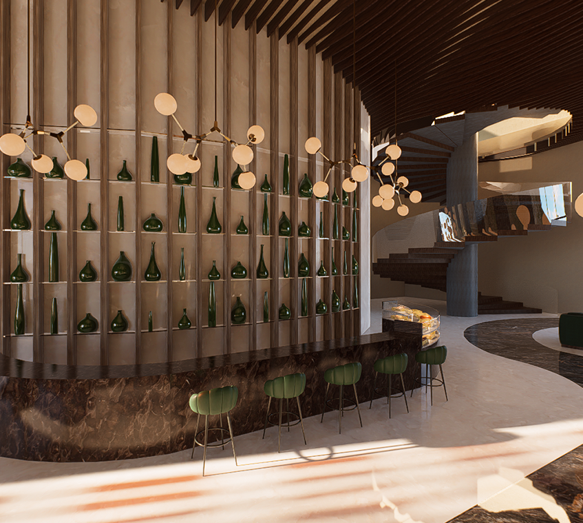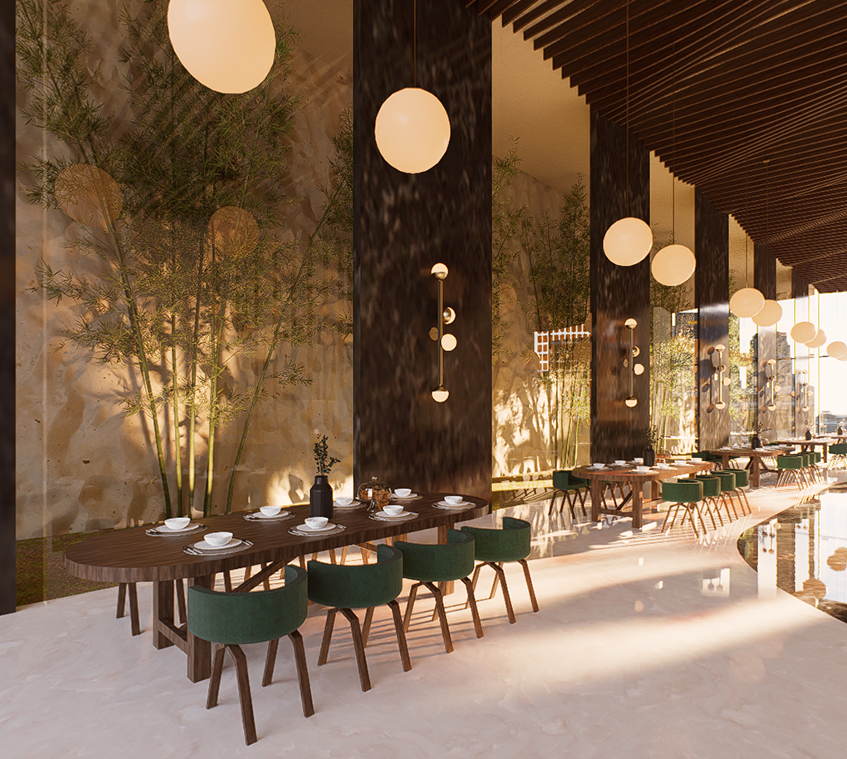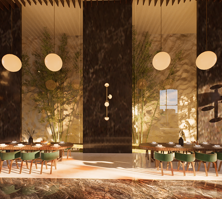 A contemporary fine-dining space inspired by nature’s warmth and geometry. The design combines organic materials, sculptural lighting, and rich green tones to create a luxurious yet inviting atmosphere.